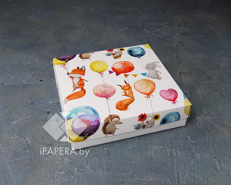 Коробка «Зверята на шариках» 12*12*4 см (белое дно)