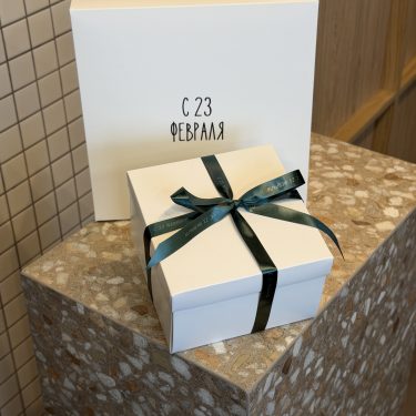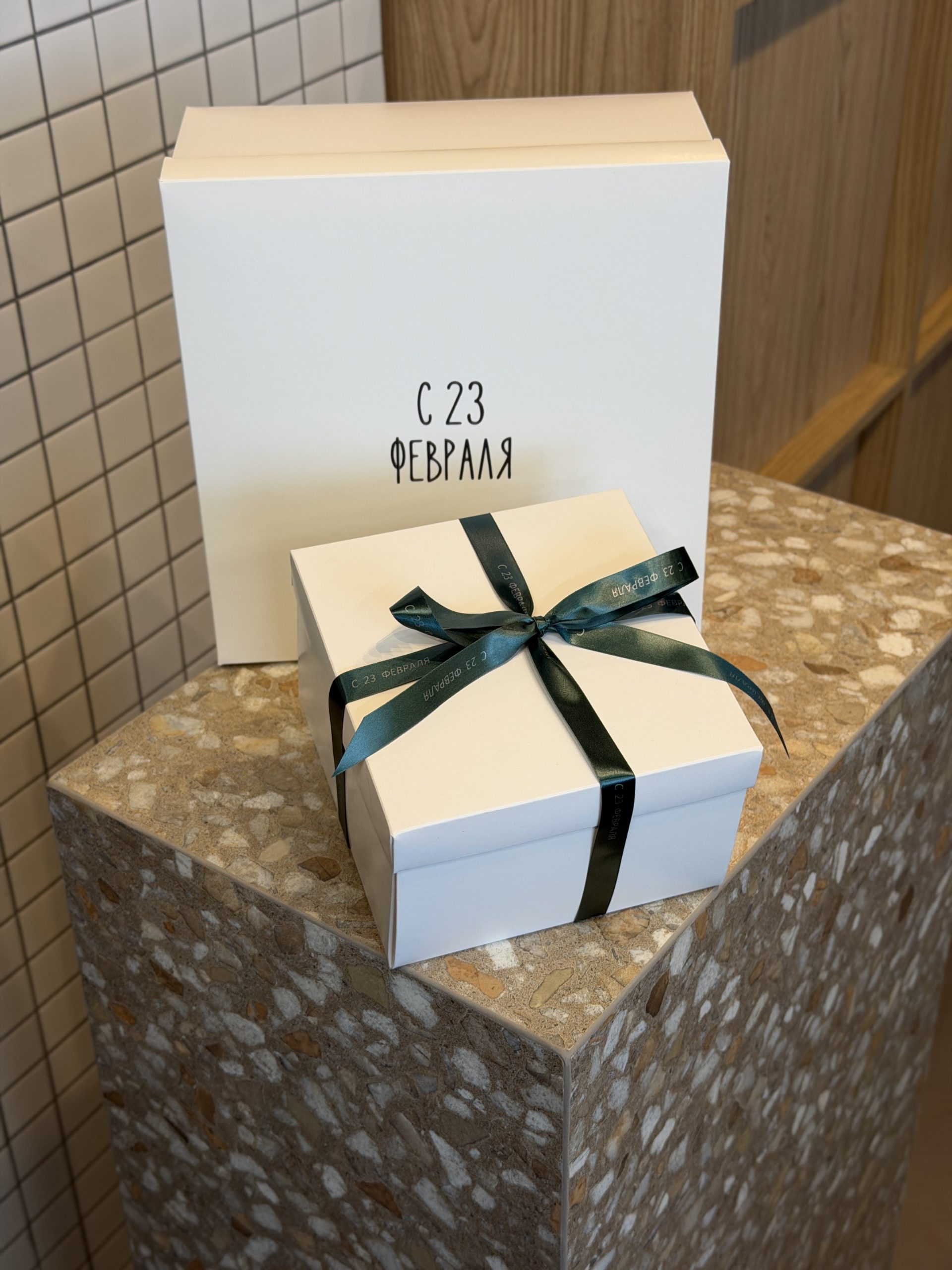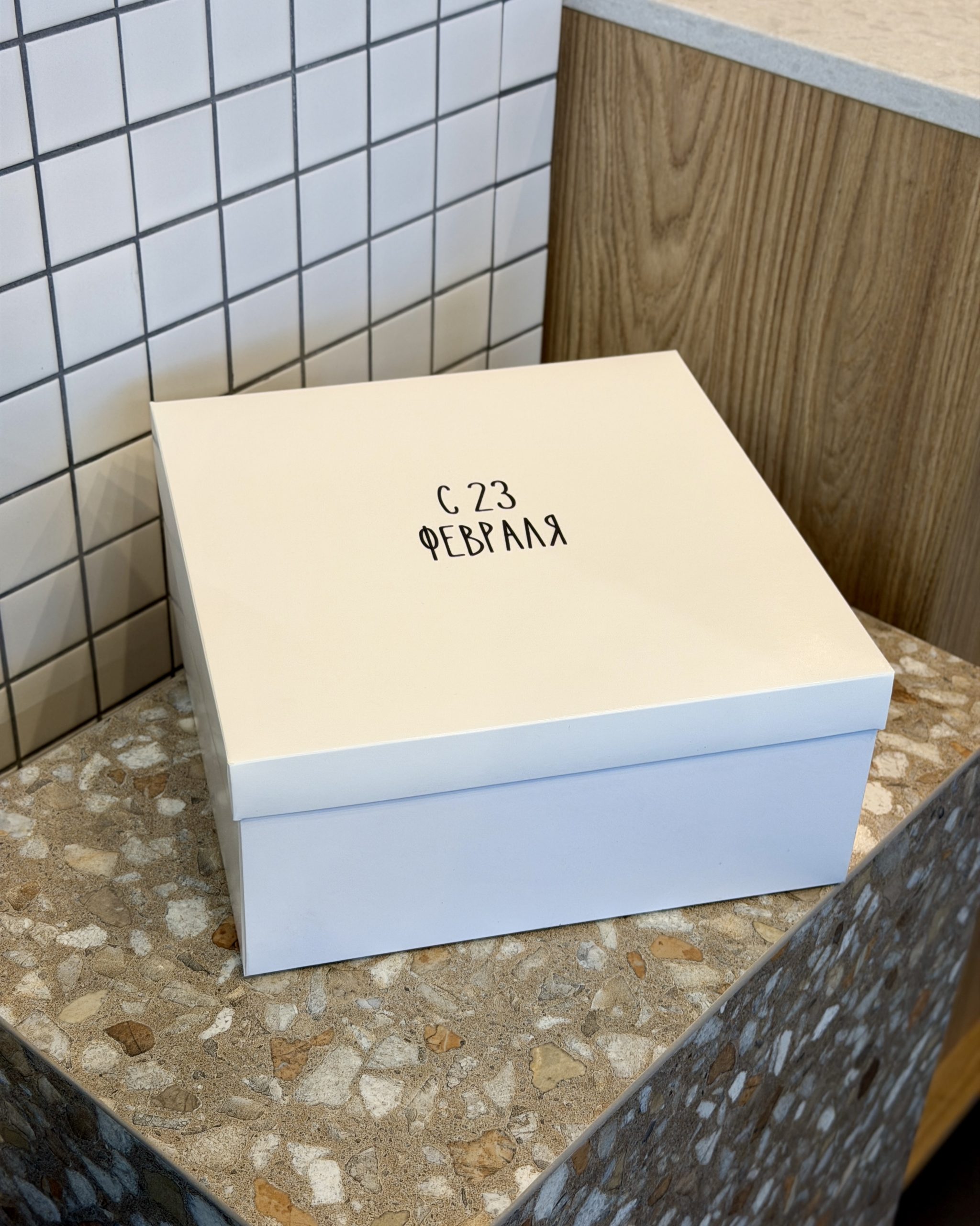 Коробка с объёмной наклейкой «23 февраля» 20*20*10 см (белое дно)