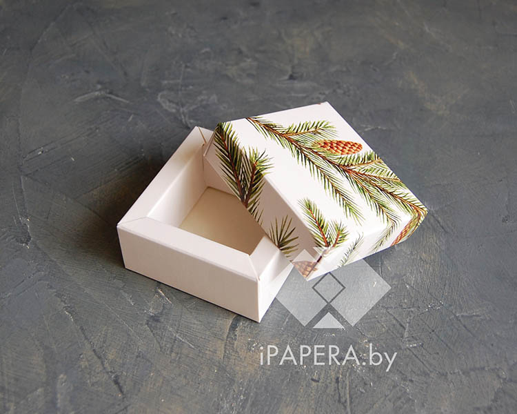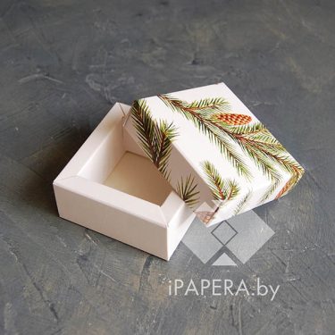 Коробка «Еловые ветки» 5*5*3 см с фальшбортом (белое дно)