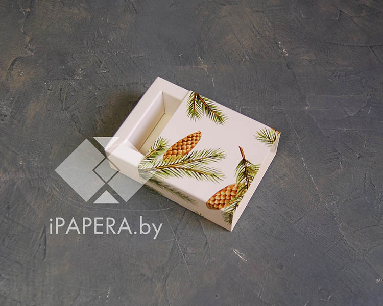 Коробка-пенал «Еловые ветки» 5*5*3 см с фальшбортом (белое дно)
