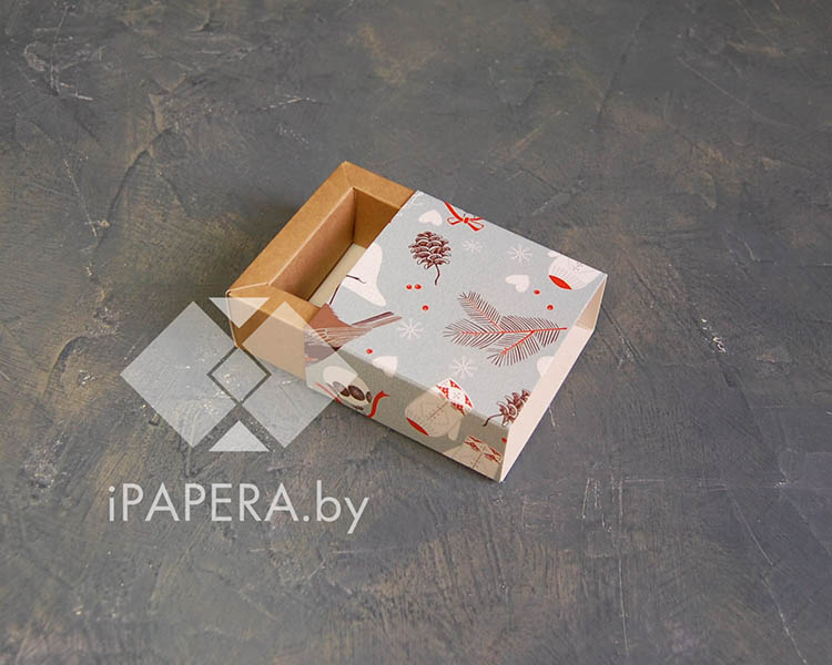 Коробка-пенал «Снегири» 5*5*3 см с фальшбортом (крафт дно)