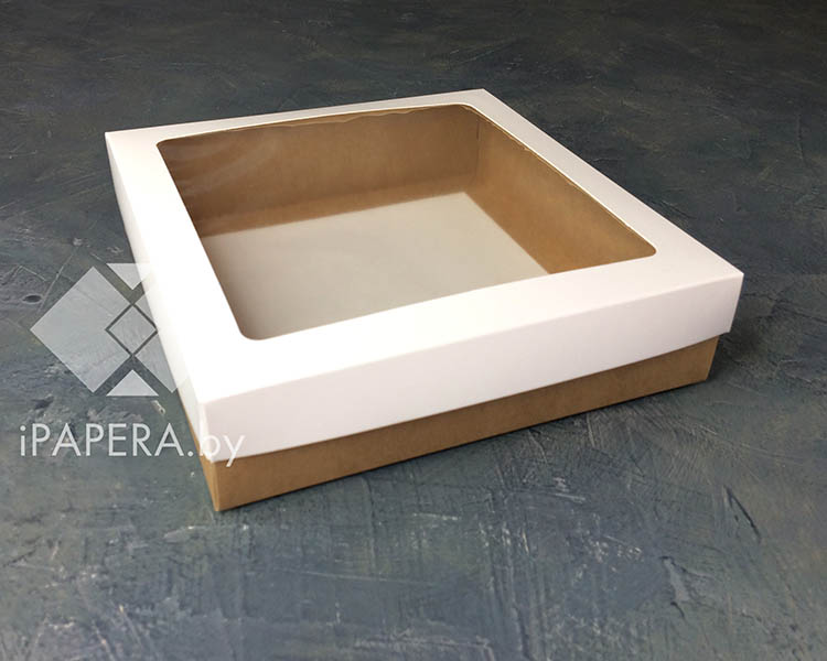 Коробка «Белая с окном» 20*20*5 см (крафт дно)