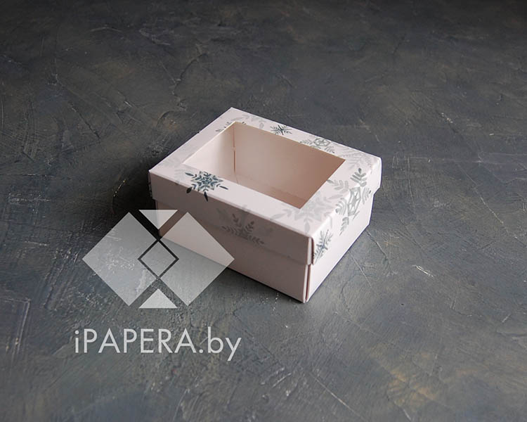 Коробка «Акварельные снежинки с окном» 10*8*5 см (белое дно)