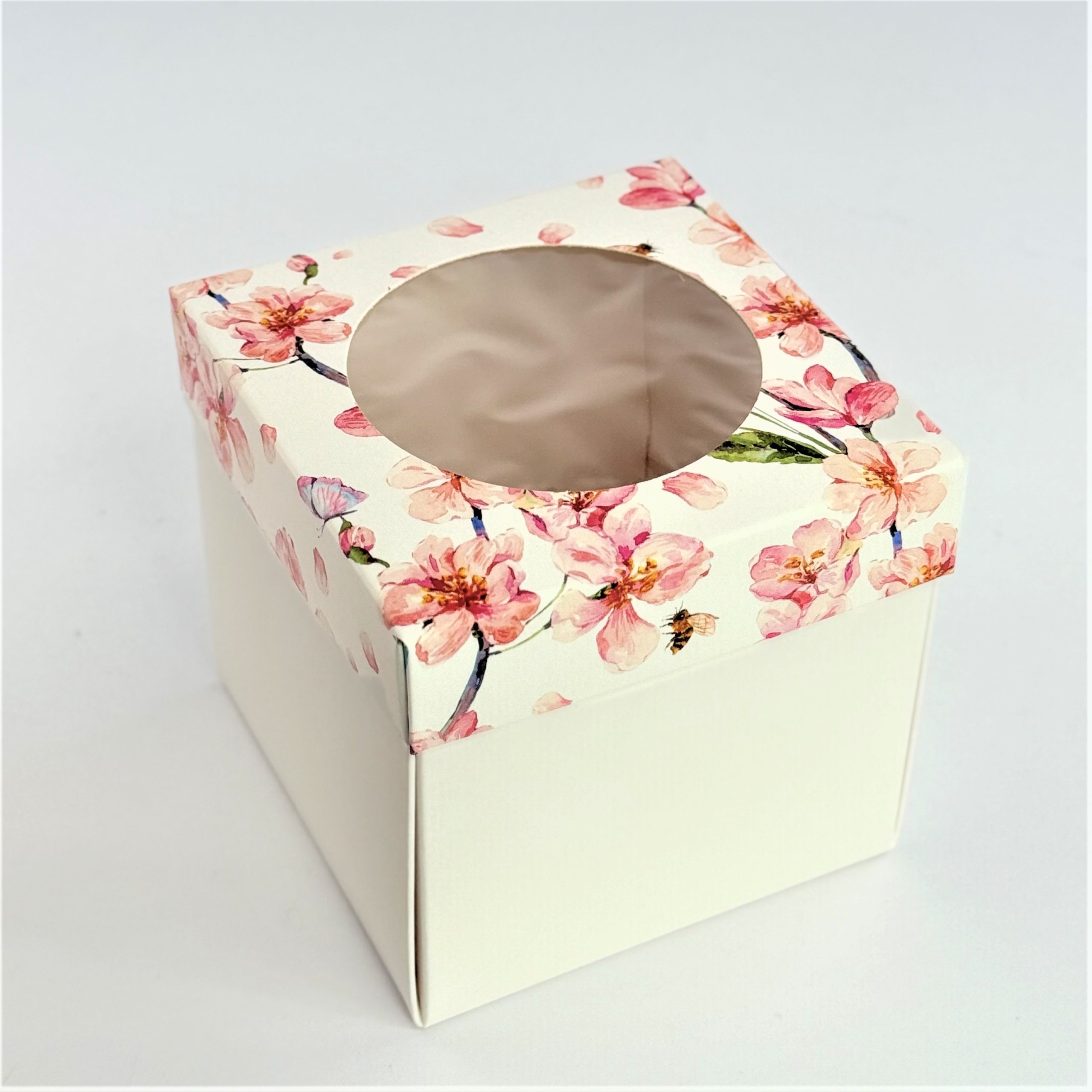 Коробка «Цветы яблони c круглым окном» 10*10*10 см (белое дно)
