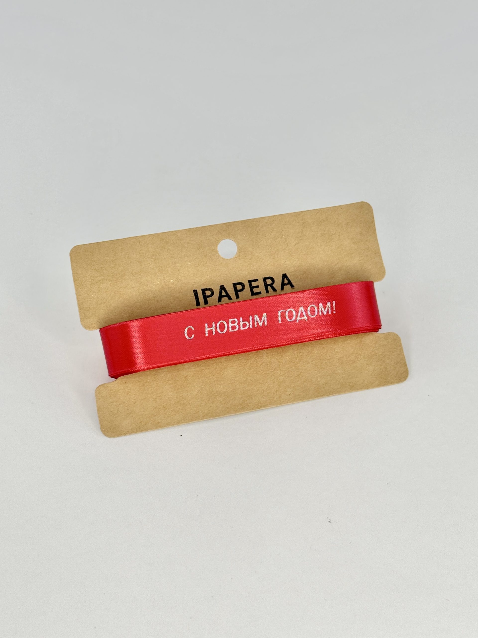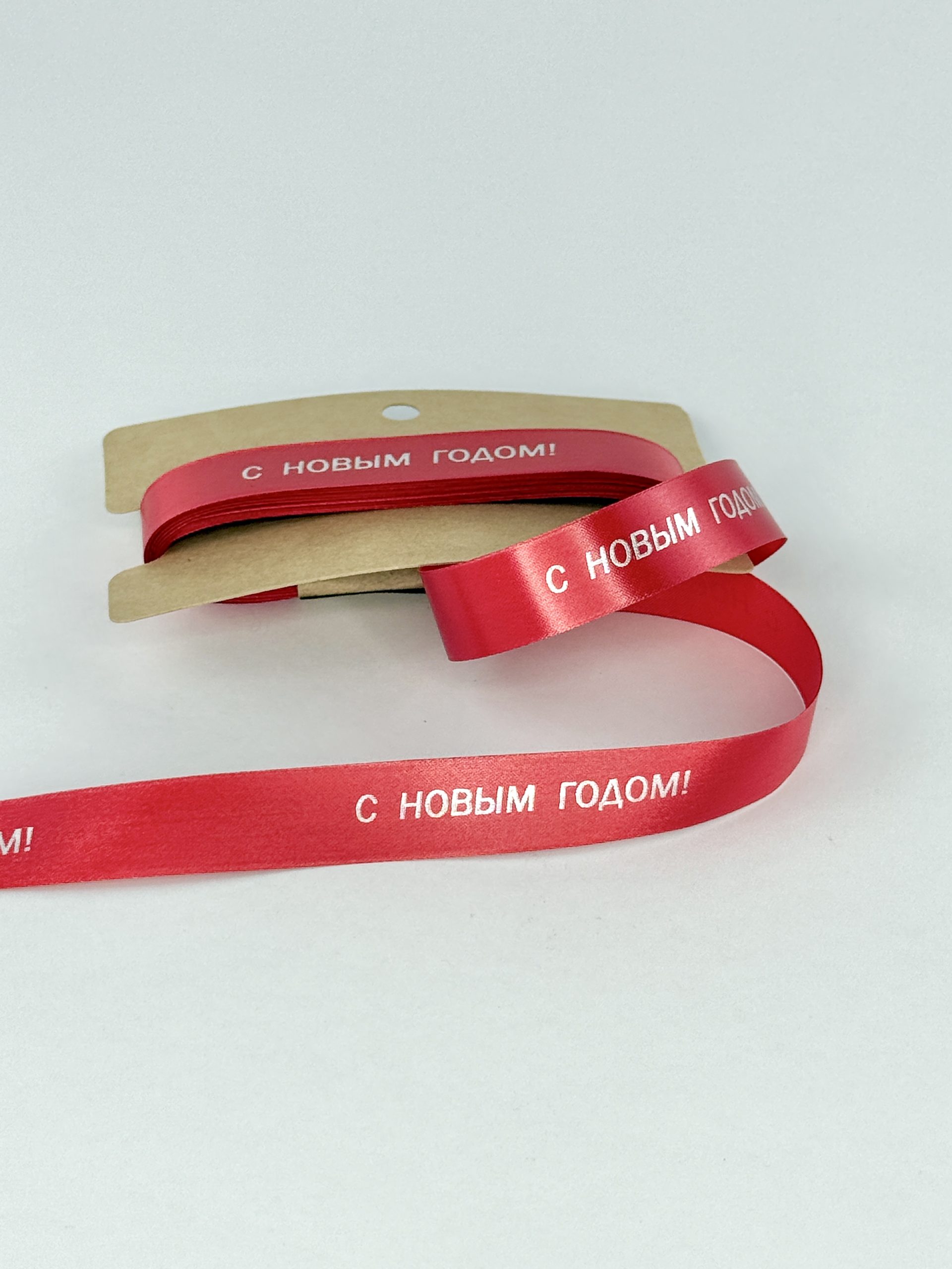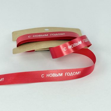Сатиновая лента малинового цвета с печатью серебряным цветом, новогодние надписи