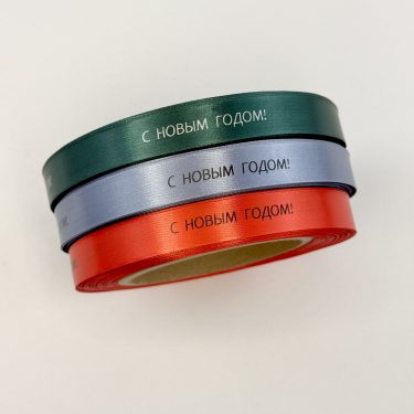 Сатиновая лента темно-зеленого цвета с печатью серебряным цветом, новогодние надписи