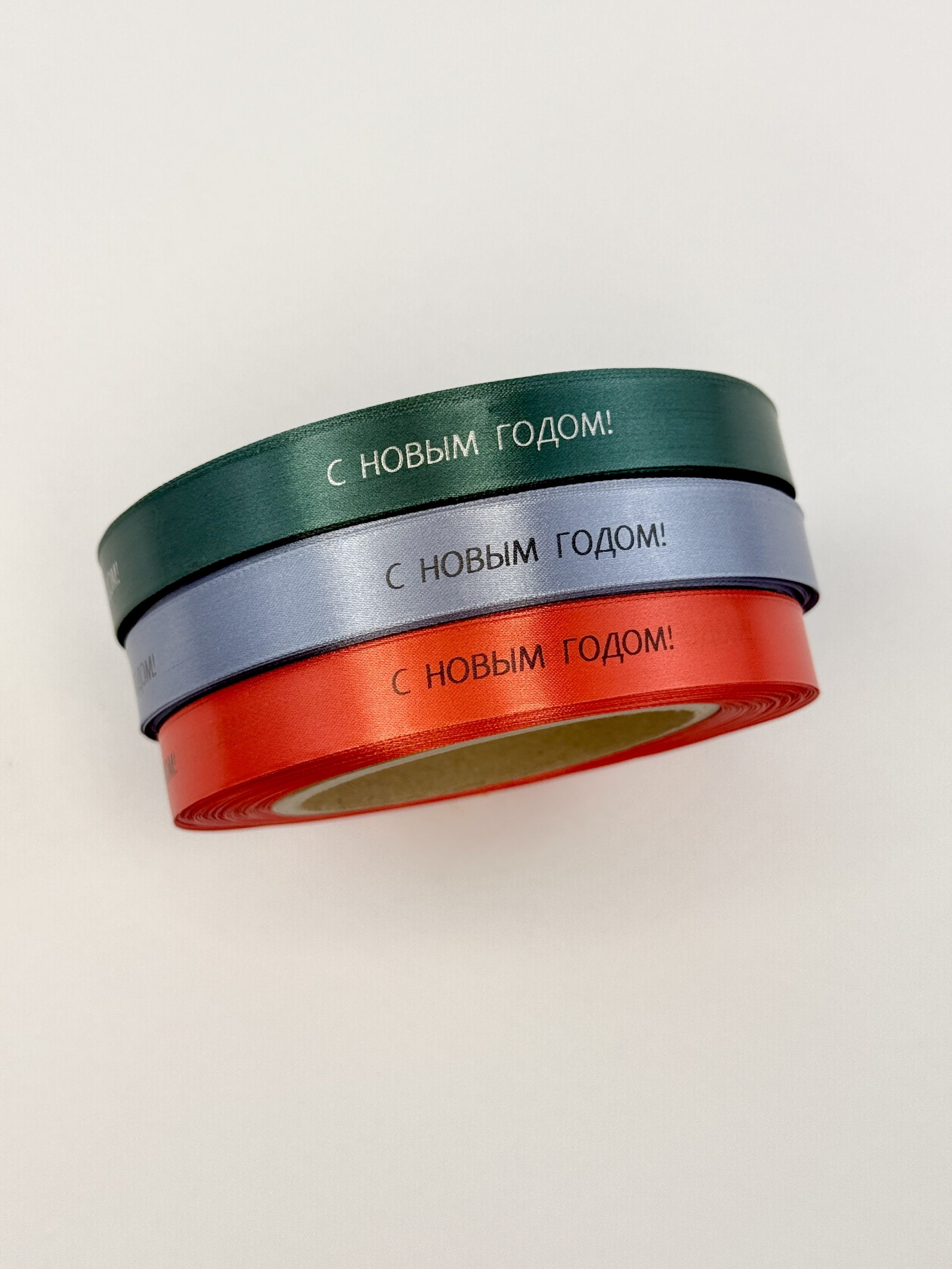 Сатиновая темно-зеленая лента «С НОВЫМ ГОДОМ!», 15 мм с серебряной печатью , 50 м