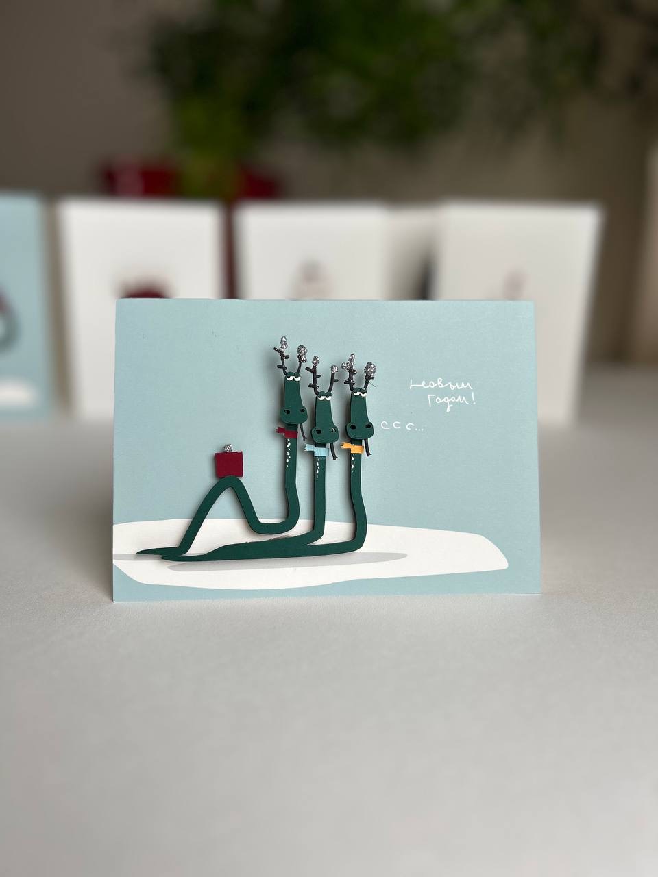 Открытка дизайнерская новогодняя ручной работы с деревянными элементами.
