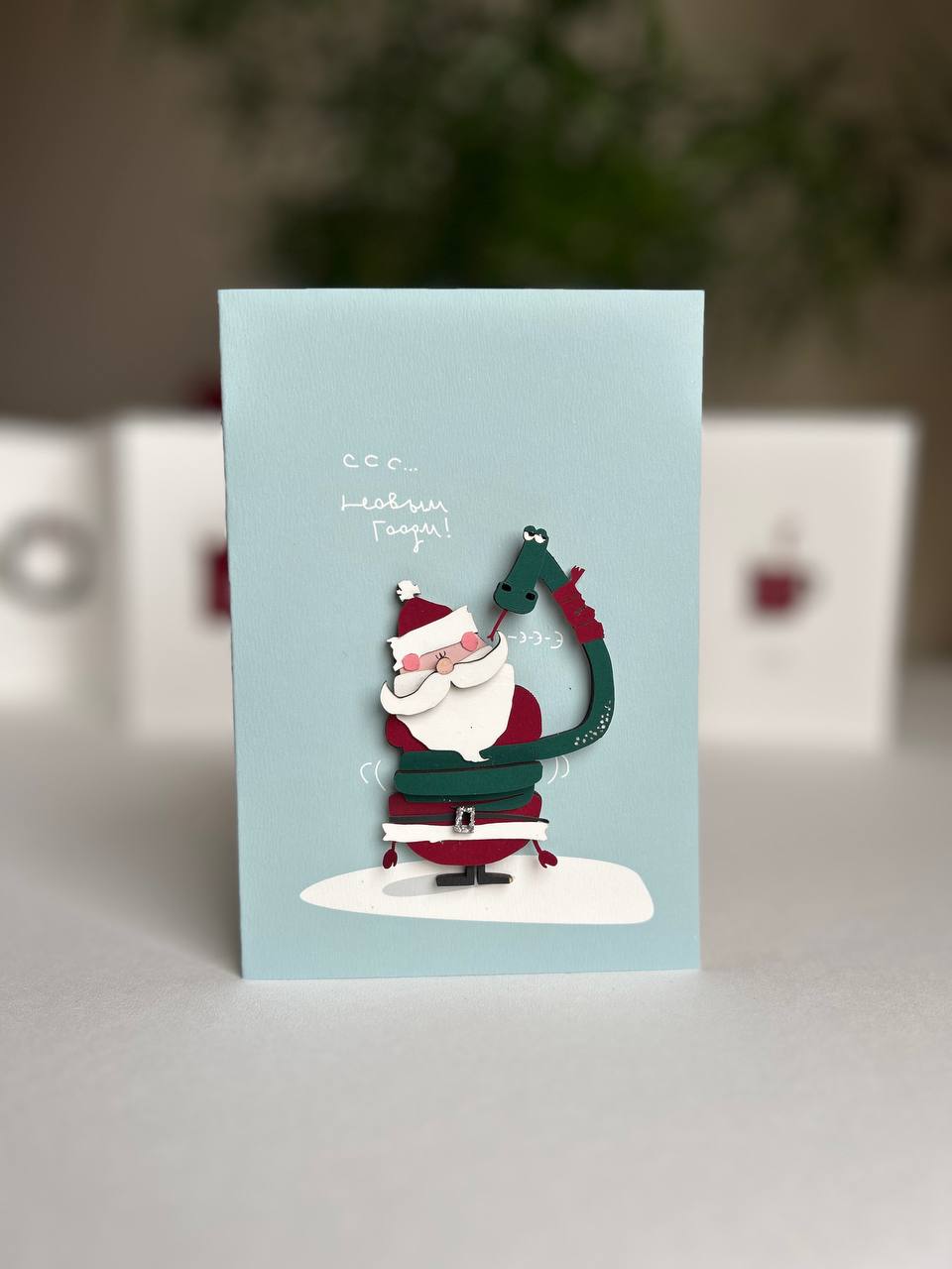 Открытка дизайнерская новогодняя ручной работы с деревянными элементами.